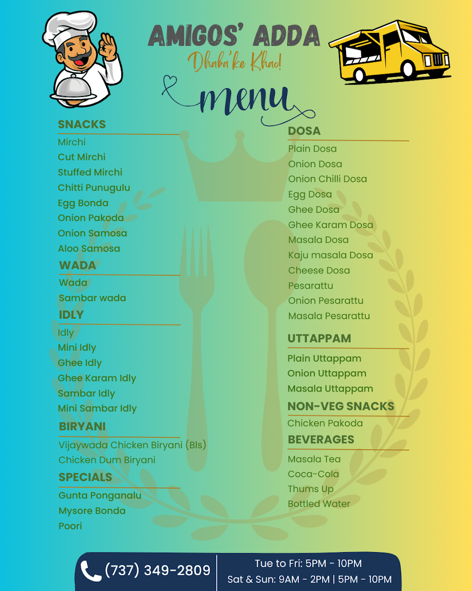 Welcome to Amigos Adda, your new go-to destination for authentic South Indian cuisine in Hutto, TX! Located at 5350 Co Rd 100, this vibrant eatery offers a mouthwatering menu that captures the essence of street food culture.